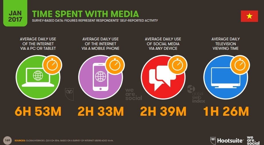 Thời gian trung bình lên mạng bằng máy tính là ~7h mỗi ngày, còn sử dụng điện thoại là 2h30p.