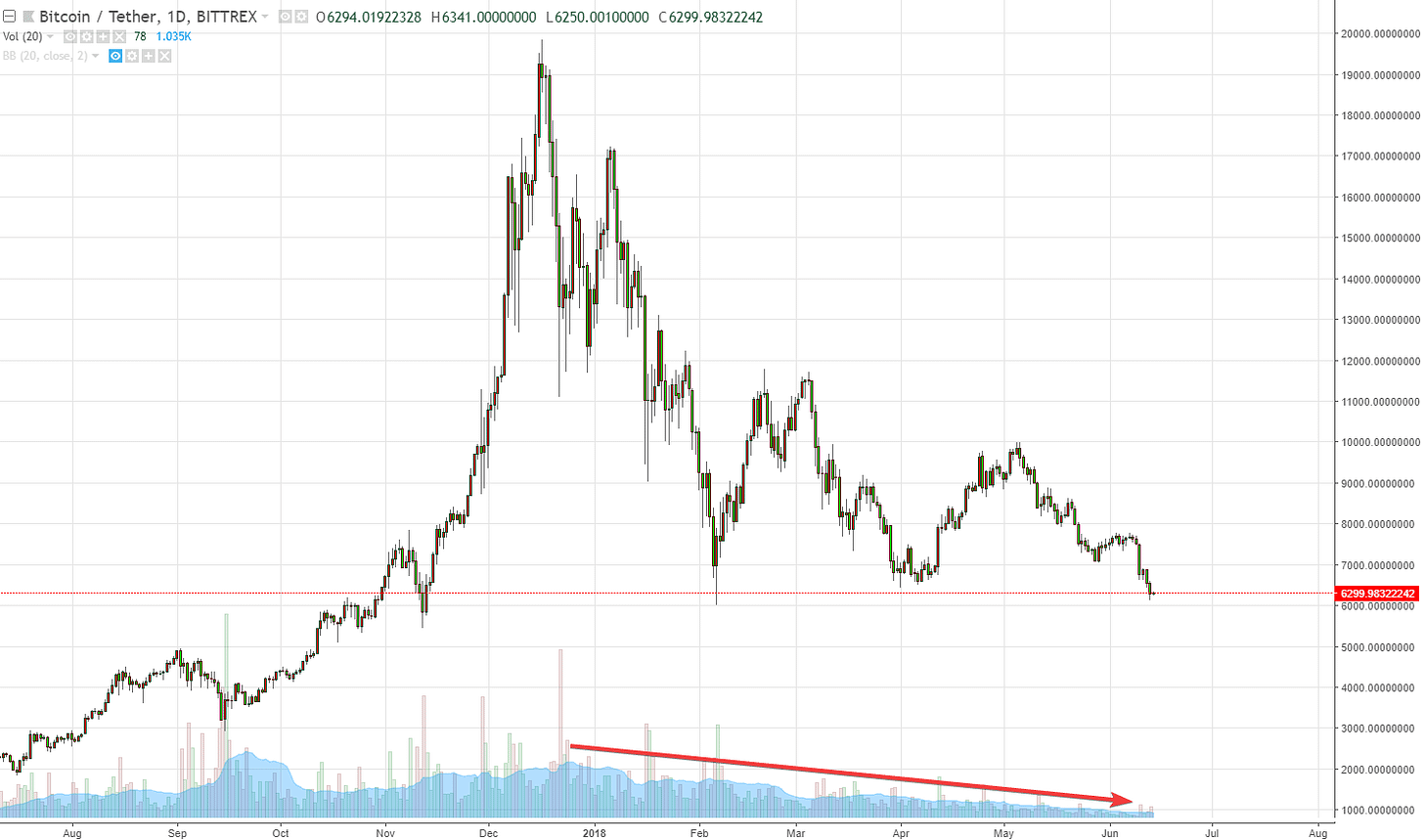 - Khi đọc sách và biết được những trạng thái tâm lý mà các nhà đầu tư trải qua và các nhận xét của các chuyên gia, đây là lúc tôi nên đi ngược chiều gió. Tôi thấy có nhiều điểm trùng hợp của hai biểu đồ. Khối lượng giao dịch càng về sau càng giảm, ít người mua và bán (mặc dù lấy biểu đồ Bittrex, nhưng khối lượng giao dịch được thống kê của cả thị trường cũng giảm theo xu hướng như vậy).